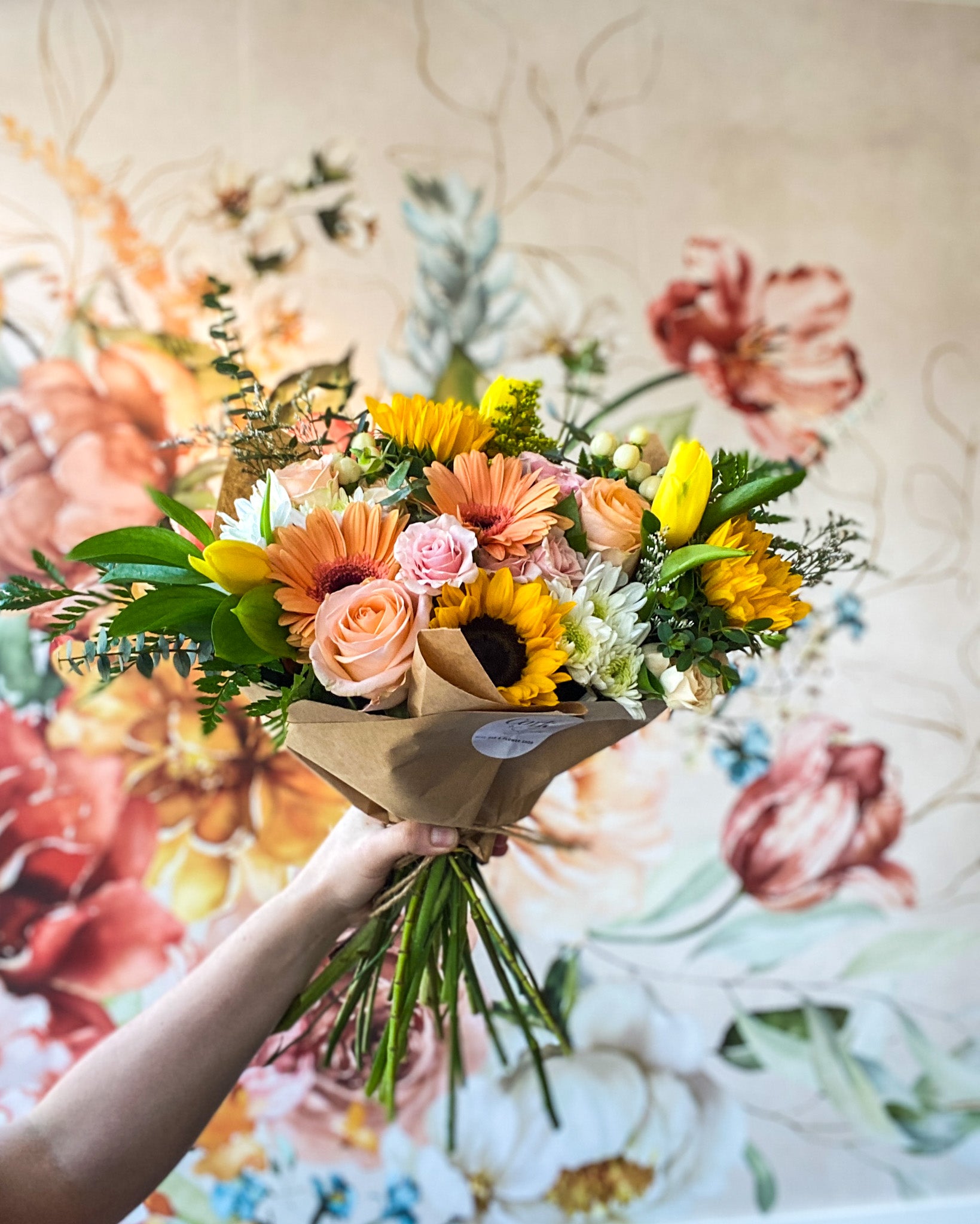 Beautifully wrapped petite arrangement with fresh, seasonal flowers. Let us know your favorite flowers and color palette and we'll make an arrangement unique to you!