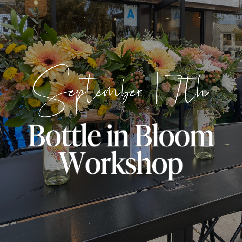 Join us on Wednesday, September 17th for a truly unique Bottle in Bloom Workshop! In this creative floral class, you'll design a fresh bouquet directly on top of a full bottle of wine—a beautiful arrangement that doubles as a gift or centerpiece.